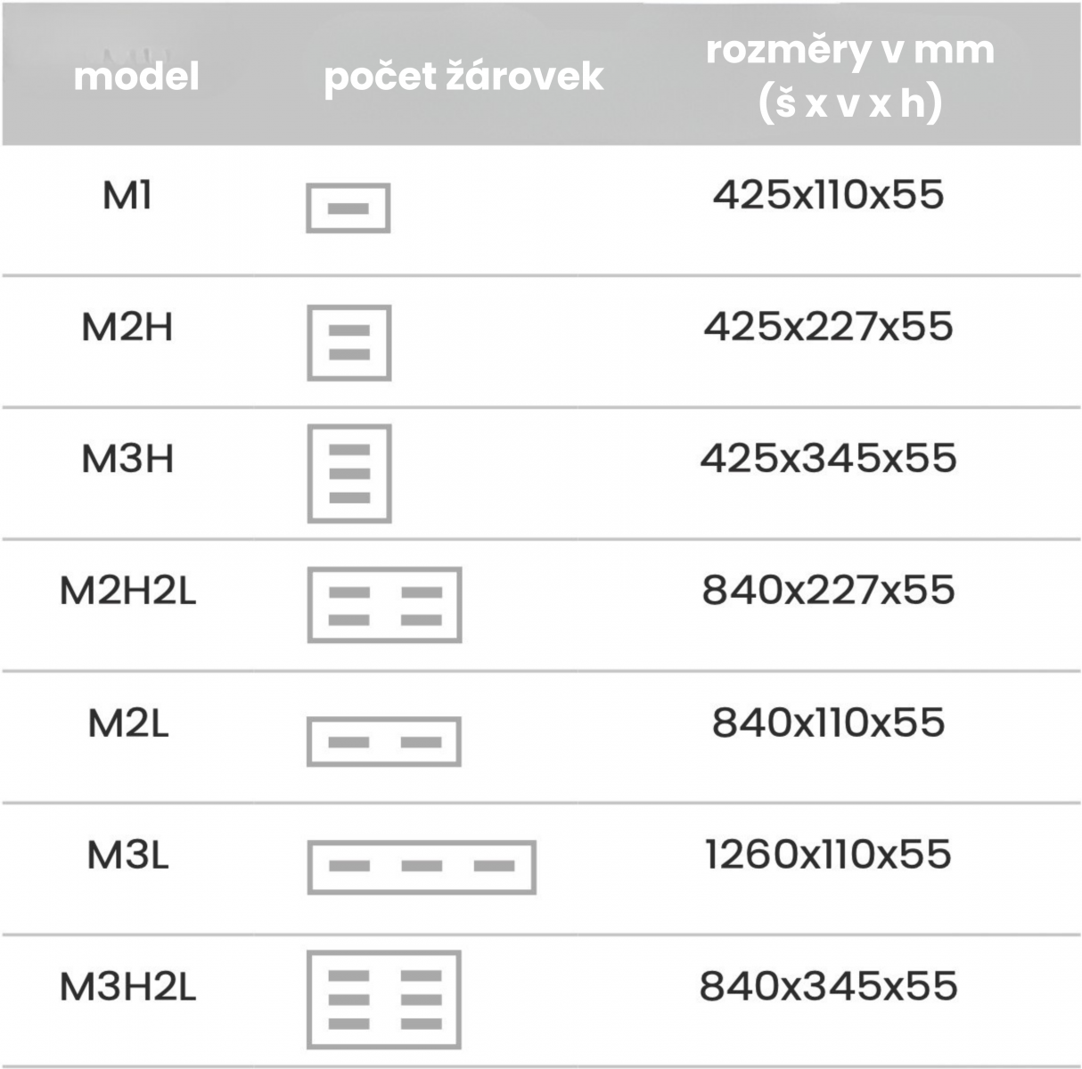 Vyžarovacia sila: 2 kW, 3 kW alebo 4 kW Napájanie: 230 V, ~50 Hz Menovitý prúd: 8,7 A, 13 A, 17,4 A Rozmery (Š x V x H): 425 mm x 227 mm x 55 mm Hmotnosť: 2,7 kg Minimálna montážna výška: 2,5 m Minimálna vzdialenosť od stropu: 0,5 m Typ vysielanej vlny: IR-A (krátke vlny) Spektrum: 1,2 μm Typ žiarovky: halogén Životnosť žiarovky: 5000 - 7000 h Bývanie: hliník (99% Al) Farba: biela, sivá, čierna alebo ľubovoľná RAL (za príplatok) Balenie: infračervený ohrievač, montážna konzola, manuál Záruka: 2 roky